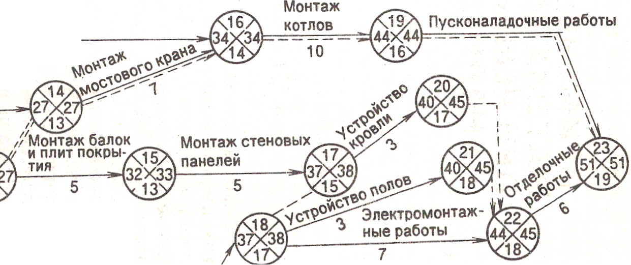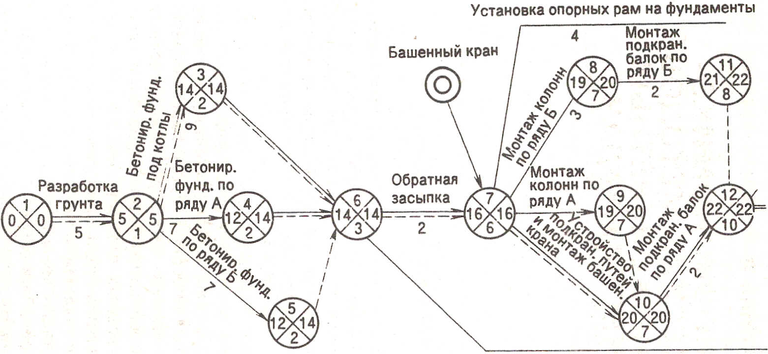 Сетевой график (рис. 6.1) позволяет выделить из всего комплекса работ наиболее важные, лежащие на критическом пути, и сосредоточить на них основные ресурсы строительно-монтажных организаций, устанавливать взаимосвязь между различными специализированными организациями и координировать их работу. Работы, лежащие на критическом пути, требуют наиболее продолжительного ожидания поступления очередного