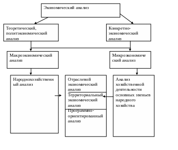 Общая схема экономического анализа представлена на рис. 7.1. Она еще не охватывает всех видов экономического анализа. Разработка специальных методов экономического анализа базируется на научно обоснованной классификации его видов, обусловленной потребностями практики управления. В основе