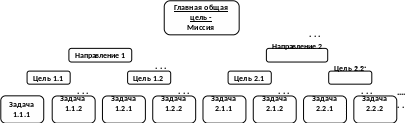 Дерево целей - структурированная, построенная по иерархическому принципу (распределенная по уровням, ранжированная) совокупность целей, в которой выделены: - генеральная цель/миссия ("вершина дерева") и подчиненные ей цели/подцели/задачи ("ветви дерева") первого и второго уровней (а при необходимости и последующих уровней). Дерево целей увязывает между собой миссию, основные цели и конкретные задачи на каждом уровне иерархии. При этом цель высшего порядка соответствует вершине дерева, а ниже - в несколько ярусов - располагаются основные (главные) и затем - локальные цели (задачи), с помощью которых обеспечивается достижение целей более высокого уровня.