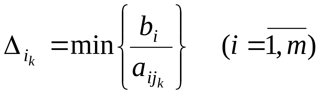 Якщо добутий варіант розв’язку не виконує умови оптимальності, то в індексному рядку знаходять елемент , який найбільше порушує ці умови. Тобто при вибирають найбільш невід’ємний елемент , при – найбільш від’ємний елемент . Такий вибір елементів дає можливість змінити значення на максимальну величину при побудові наступної симплекс-таблиці.