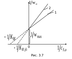 Обработка экспериментальных данных в двойных обратных координатах, приведенная на рис. 3.9 (1 в отсутствие ингибитора;
