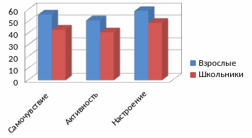 Из таблицы мы видим, что средний балл по самочувствию, активности и настроению значительно выше у взрослых во всех категориях, что свидетельствует о заниженной самооценке у школьников. Из этого следует, что подросток зачастую не уверен в себе, в своих силах и не может адекватно оценивать свое состояние.