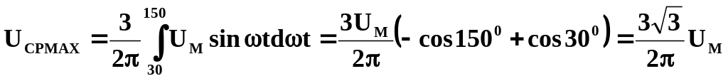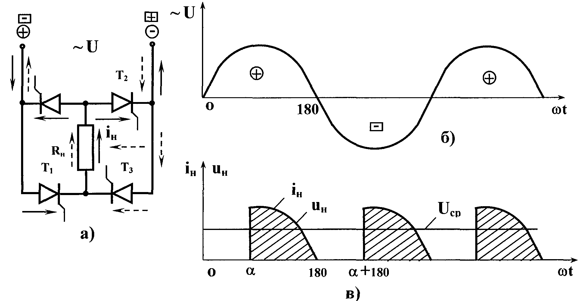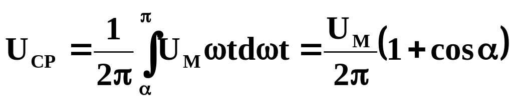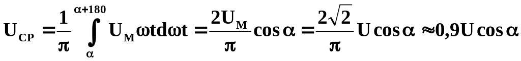 Сонымен, жүктеменің индуктивті сипаты болғанда, түзетілген кернеу қисығының оң және теріс учаскелері болады, сондықтан жүктемедегі кернеудің орта мәні сызбанұсқаның екі фазалылығы ескерліп, мына түрде жазылады:
