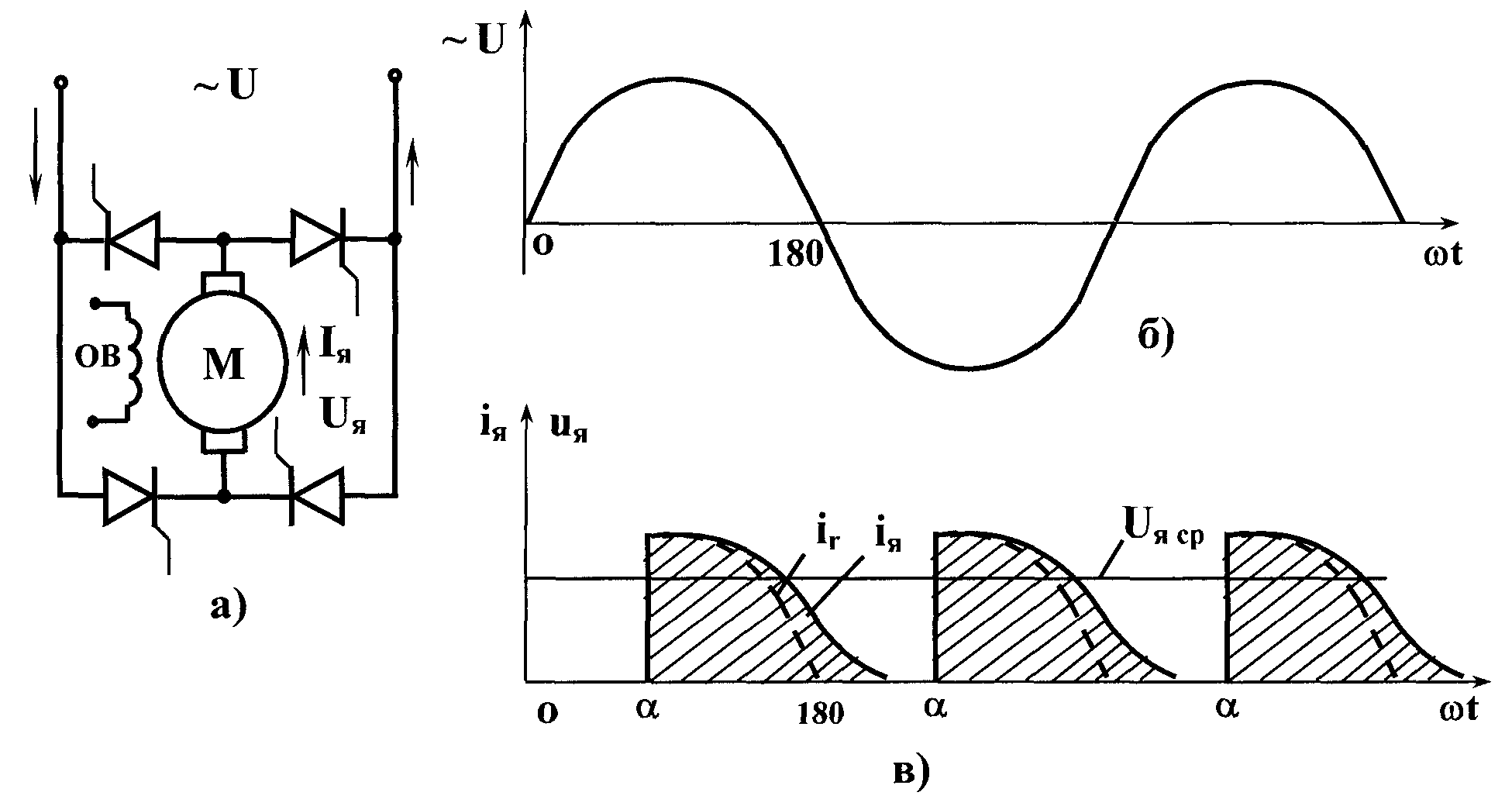 Тұрақты ток қозғалтқышын тиристорлы түрлендіргіштің көмегімен басқару сызбанұсқасы мен кернеу және ток қисықтары 2.4 - суретте көрсетілген.