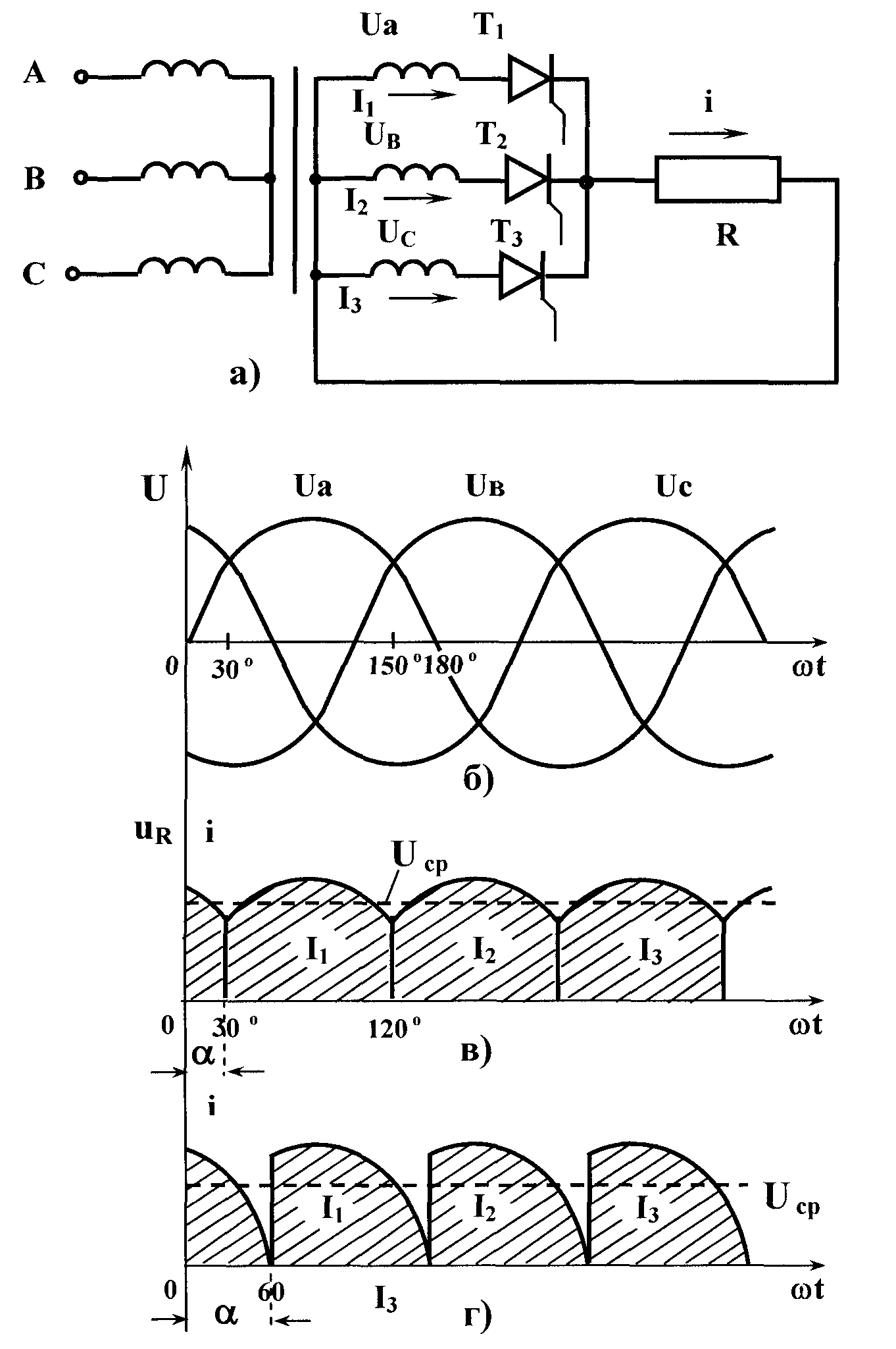 Үш фазалы басқарылатын түзеткіштер. Фазаларға келетін жүктеменің біркелкілігін және түзетілген кернеудің пульсациясын төмендету үшін басқарылатын үш фазалы түзеткіштер қолданылады. Жүктеменің индуктивтілігі жеткілікті дәрежеде жоғары деп есептеп, яғни токтың үздіксіздігін қамтамасыз етеді деп есептеп, осындай бір сызбанұсқаның жұмыс жасау ерекшеліктерін талдап қарайық.