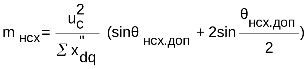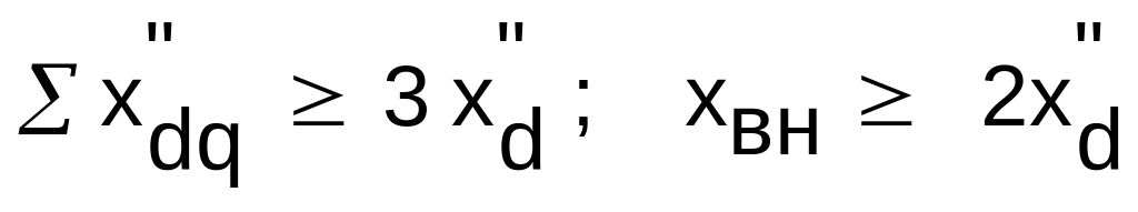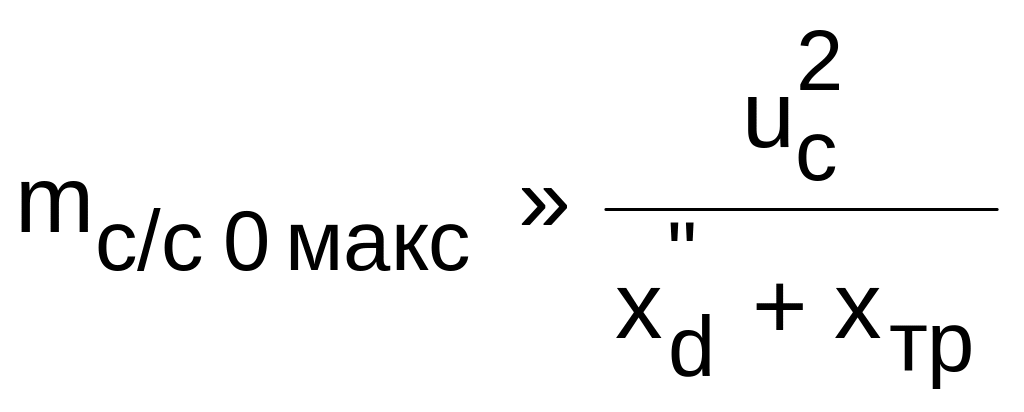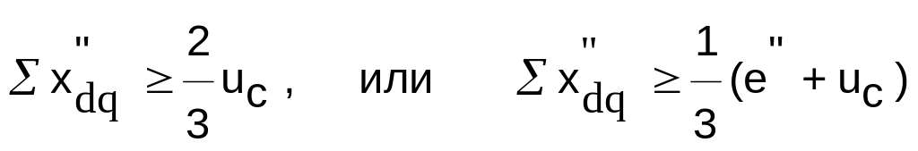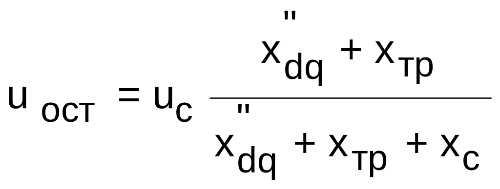 В момент включения невозбужденного генератора в сеть из-за большого падения напряжения в нём (ΔUген = Iп.с/с 0·x’’dq) происходит "посадка" напряжения в системе, которая тем больше, чем меньше разница мощностей генератора и системы. Остаточное напряжение в точке подключения генератора на параллельную работу может быть определено по следующим выражениям: