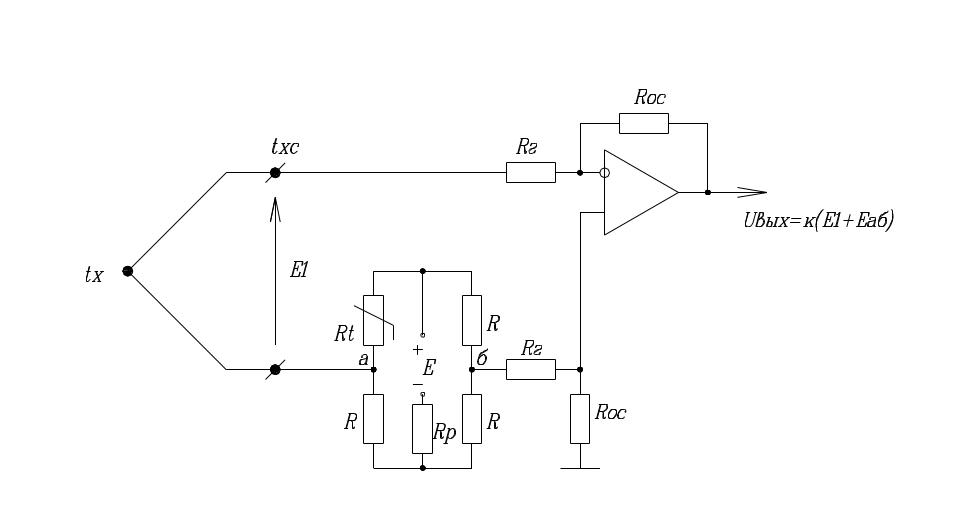 Резистор Rt помещен в непосредственной близости от свободных концов термопары. При нулевой температуре мост находится в равновесии и напряжение на его диагоналях равно нулю. При повышении температуры свободных концов медный резистор Rt увеличивает свое сопротивление, мост выходит из равновесия, и на его диагоналях появляется напряжение, компенсирующее изменение термоЭДС. Изменение крутизны моста для подгонки его под конкретную термопару служит Rр. Следует отметить, что вследствие нелинейности напряжения выходного моста, а также нелинейности термопары, полной компенсации влияния температуры свободных концов осуществить не удается, и поэтому используются вместо моста медные термометры сопротивления или же полупроводниковый датчик типа AD590 и линеаризующие схемы либо при наличии вычислительных устройств програмным способом.