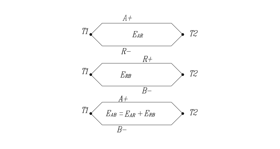 Если в термометрах индуцируется термоЭДС Е1 при Т1 и Т2 и Е2 при Т2 и Т3, то в случае, когда спаи находятся при Т1 и Т3 термоЭДС будет равна Е1+Е2, что обозначает, что градуировочные таблицы можно использовать даже при отличии t° холодного спая от 0°С.