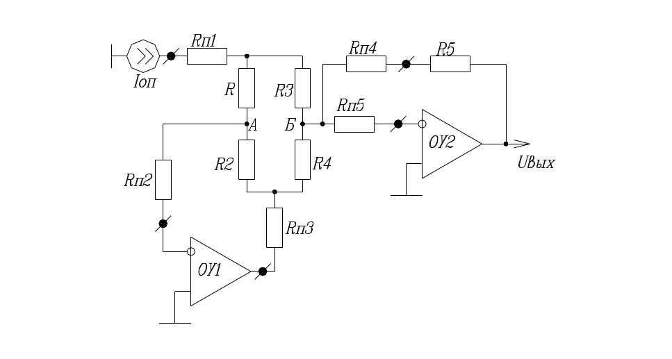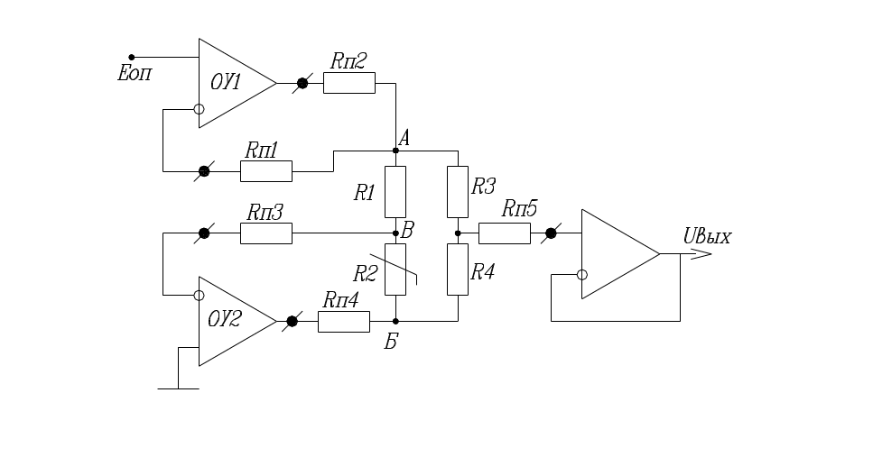 квазиуравновешенный мост). В этой схеме потенциал т. А поддерживается равным 0 с помощью ОУ1, а потенциал т. Б поддерживается равным 0 за счет ООС ОУ2. Поскольку напряжение в измерительной диагонали примерно равно 0, то и влияние емкостей, подходящих к измерительной диагонали, будет несущественным. Сопротивления Rп2 и Rп5 не оказывают влияния, т.к. они включены последовательно с высокоомным входом ОУ1.