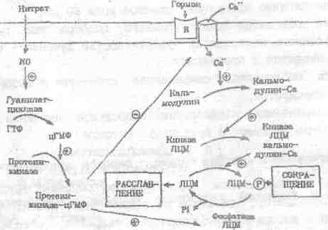 Рис. 1. Механизмы блокирования нитратами рецептор-зависимого входа Са2+ в клетки и дефосфорилирования легких цепей миозина (ЛЦМ), приводящие к реализации вазодилатирующих эффектов нитратов.