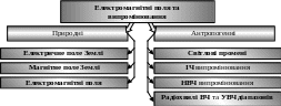 електромагнітних полів — атмосферна електрика, радіовипромінювання Сонця і галактик, електричні і магнітні поля Землі, штучні джерела випромінювання;