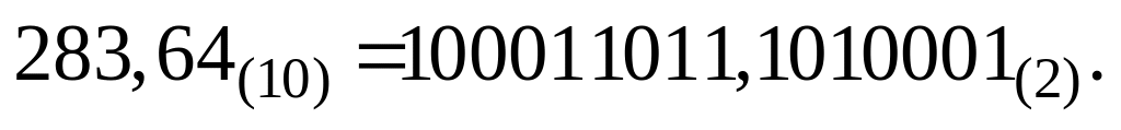 Рассмотрим пример перевода десятичного числа 283,64 в двоичную систему счисления с точностью до семи знаков после запятой.