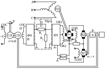 - •Структурна схема слідкуючої сау зі зворотнім зв’язком за струмом та швидкістю