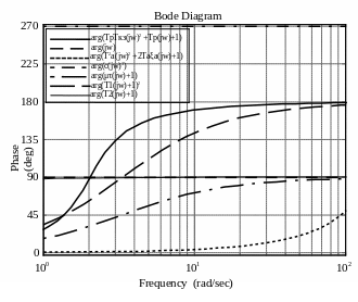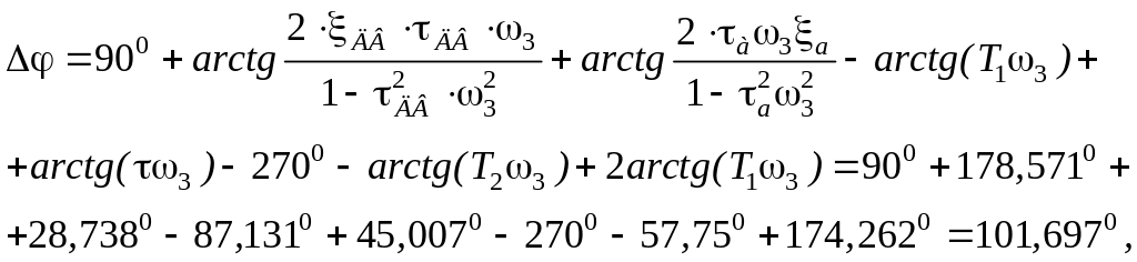 Для контрольної перевірки визначенного запасу стійкості внутрішнього контуру на частоті на рис. 31 зображені ЛФЧХ кожної з ланок, що входять у вираз .