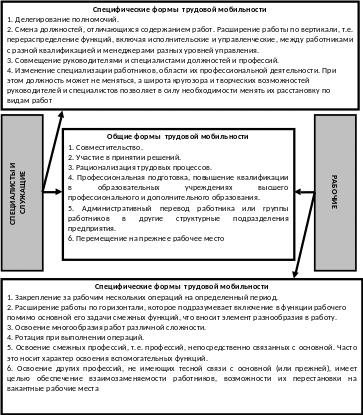 Внутрифирменная трудовая мобильность осуществляется между подразделениями (цехами, участками), внутри подразделений между рабочими местами, между профессиями, должностями, категориями. Формы проявления трудовой мобильности различны, и задача заключается в том, чтобы использовать наиболее рациональные из них применительно к конкретным условиям. Трудовая мобильность внутри предприятия может протекать неорганизованно (стихийно) и организованно (планово). Неорганизованная трудовая мобильность осуществляется по инициативе самих работников, может проявляться в виде текучести кадров. Организованная трудовая мобильность отражает производственную необходимость перераспределения рабочей силы между сферами труда в зависимости от таких условий, как структурная динамика производства, профессиональные изменения и т.д. Формы трудовой мобильности можно разделить на общие, применимые для всех категорий работников предприятия, и специфические, применимые только для определенной категории. Формы трудовой мобильности разных категорий работников отражены на рисунке 2