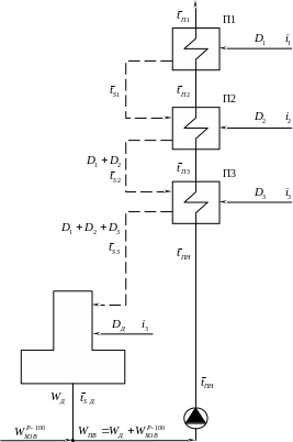 Перед тем как приступить к расчету тепловых схем турбин ПТ-135 и Р-100, необходимо решить вопрос о подогреве такого большого потока обессоленной воды. Исходим из того, что большая часть этой воды будет подогреваться в ПДХОВ; остальной поток обессоленной воды целесообразно направить в точки смешения систем регенерации турбин ПТ-135 для ее подогрева в ПНД этих турбин.