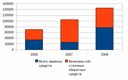 Отчетливо видно, что в 2008 году собственные средства преобладали над заемными, в 2009 году положение изменилось и за счет кредиторской задолженности доля заемных средств увеличивается в два раза.