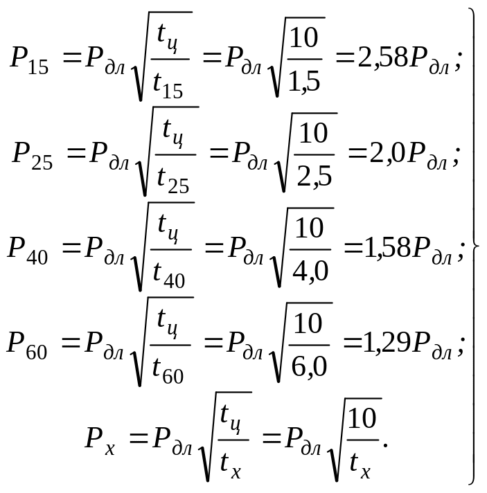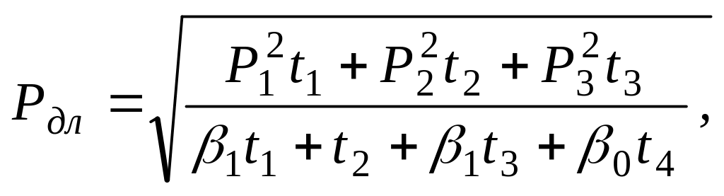 Метод эквивалентных потерь. Так как при повторно-кратковременном режиме работы периодически происходит охлаждение электродвигателя, рассчитанного на длительный режим работы, то можно, не боясь его перегрева, взять увеличенную мощность по сравнению с номинальной, указанной в паспорте. Такое изменение мощности подается расчету, если допустить, что нагрев обмоток двигателя в основном определяется переменными потерями, пропорциональными квадрату мощности. Исходя из этого допущения, составляем равенство, являющееся исходным для пересчета мощности с одной продолжительности рабочего периода на другую, то есть