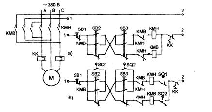 Схема управления включает катушки двух пускателей КМВ (вперед) и КМН (назад), нагревательные элементы и контакты тепловых реле КК, кнопки SB1 "Стоп", SB2 "Пуск вперед" и SB3 "Пуск назад". В схеме реверсивного управления обязательно должны быть блокировки, исключающие одновременное включение двух пускателей КМВ и КМН, в противном случае произойдет короткое замыкание. Для предотвращения одновременного включения двух пускателей управления ими осуществляется через кнопки SB2, SB3 имеющие как замыкающие, так и размыкающие контакты (вариант а). В цепь управления каждой катушки включается замыкающий контакт одной кнопки и размыкающий контакт другой (электрическая блокировка с помощью кнопочной станции). В этом случае при нажатии одновременно двух кнопок SB2 и SB3 разрываются цепи питания обоих катушек. Однако наличие блокировки только кнопками не исключает включения пускателей одновременно. Например, если контакты одного пускателя приварились, то другой кнопкой можно включить другой пускатель и вызвать короткое замыкание. Для предотвращения этого устраивают механическую или электрическую блокировку пускателей с использованием их размыкающих блок - контактов.