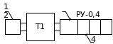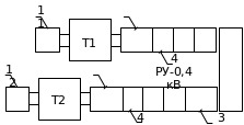 Рис. 1.2. Варианты возможной компоновки КТП: а − с одним трансформатором и линейным размещением шкафов; б − с двумя трансформаторами и линейным размещением шкафов; в − с двумя трансформаторами и П-образным размещением шкафов; 1 − шкаф ввода высокого напряжения; 2 − шкаф ввода в РУ-0,4 кВ; 3 − шкаф с секционным выключателем; 4 − шкаф (стойка) с отходящими линиями; Т, Т1, 2 − силовые трансформаторы |