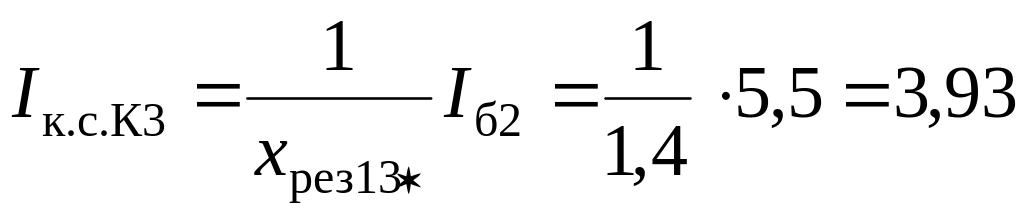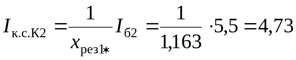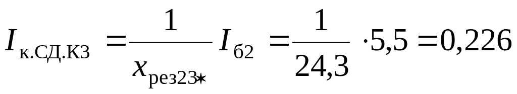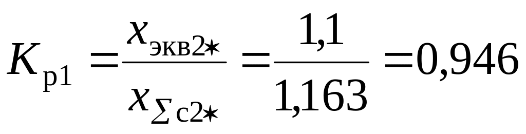 Объединять систему бесконечной мощности и синхронный двигатель нельзя, поэтому определяем токи с помощью коэффициентов распределения. Находим эквивалентное сопротивление от источников питания, коэффициенты распределения и результирующие сопротивления до точки К2 по (3.11)−(3.13):