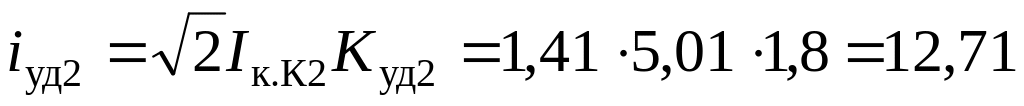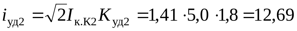 11. Определяем ударные токи, кА, в точках К2, К3. Находим ударные коэффициенты (табл. 3.3), Kуд1 = Kуд2 = 1,8.