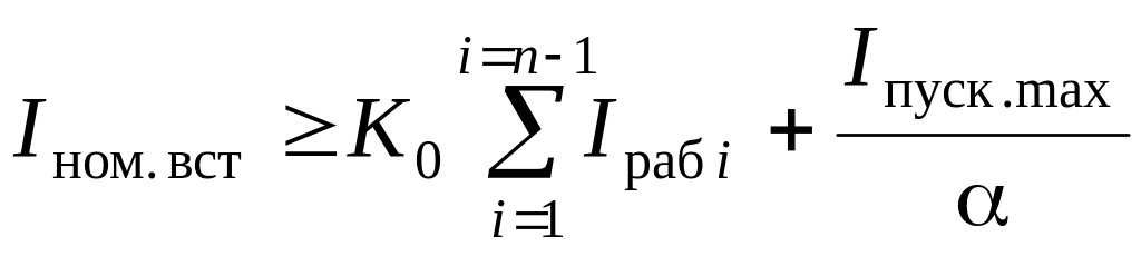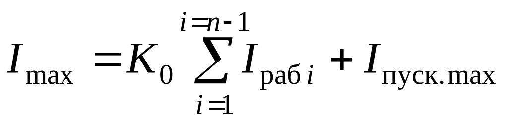 В выражении (5.11) необходимо учесть, что суммироваться должны рабочие токи всех потребителей, за исключением рабочего тока наиболее мощного электродвигателя, так как этот двигатель должен запуститься при остальных работающих.