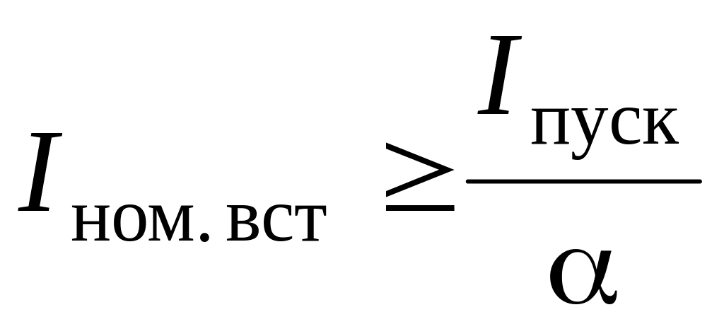 где α – коэффициент, зависящий от условий пуска и типа электродвигателя. При защите двигателя с короткозамкнутым ротором и легкими условиями пуска (длительность не более 5 с) принимается 2,5; при тяжелых и частых пусках (длительность более 10 с, частота более 15 раз в час) принимается 1,6; при защите двигателей с фазным ротором – 0,9; Iпуск – пусковой ток электродвигателя.