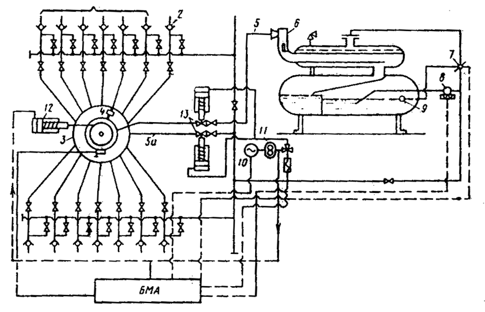 5.1. Сурет. А-Спутнигінің жалпы сұлбасы 1- ұңғыдан өнімді лақтыру (шығару) желісі; 2- кері клапаны; 3- көпжүрісті ұңғыларды қосқыш; 4- ұңғының роторлық қосқышының (ауыстырғышының) жылжымалы кареткасы (қорабы); 5- бір ұңғыға арналған өлшегіш келте құбыр; 5а- жинау коллекторы (құбыры); 6– гидроциклонды айырғыш; 7- тосқауыл жапқыш (яғни, заслонка); 8- турби-налы есептегіш; 9- қалқымалы деңгей реттегіш; 10- электроқозғалтқыш; 11- гидрожетек; 12- күш цилиндрі; 13- ажыратқыштар (отсекателдер). |