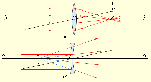 Лучи, падающие на рассеивающую линзу, по выходе из неё будут преломляться в сторону краёв линзы, то есть рассеиваться. Если эти лучи продолжить в обратном направлении так, как показано на рисунке пунктирной линией, то они сойдутся в одной точке F, которая и будет фокусом этой линзы. Этот фокус будет мнимым.