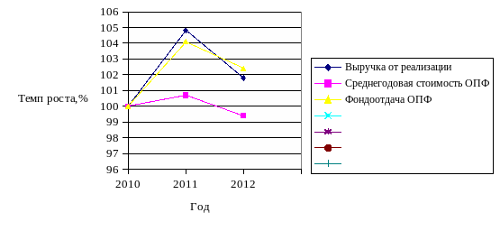 А снижение стоимости ОПФ в 2012 г. на 0,3 млн. руб. привело к увеличению фондоотдачи на 0,03 руб./руб.