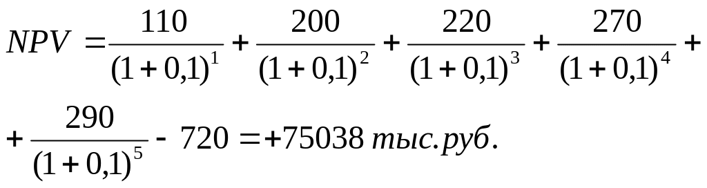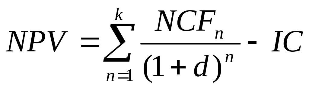 1 – чистый дисконтированный доход (NPV - Net Present Value) в случае единовременных инвестиций рассчитывается как: