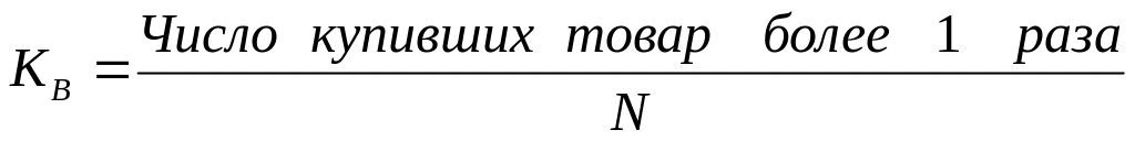 степень повторного приобретения (коэффициент повторного проникновения). Вторичный спрос для товаров краткосрочного использования означает, что потребитель продолжает покупать этот вид или марку товара, т. е. остается ее приверженцем. Для товаров длительного пользования вторичный спрос означает возвращение к данной марке товара при замене товара или при дополнительном приобретении. Коэффициент повторного проникновения (Кв) можно рассчитать как: