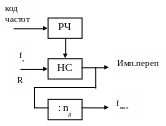 В регистр частоты записывается код частоты, этот код приплюсовывается к накопителю – сумматору и в какой-то момент происходит переполнение И-С и появляются импульсы переполнения. В И-С остается остаток R.