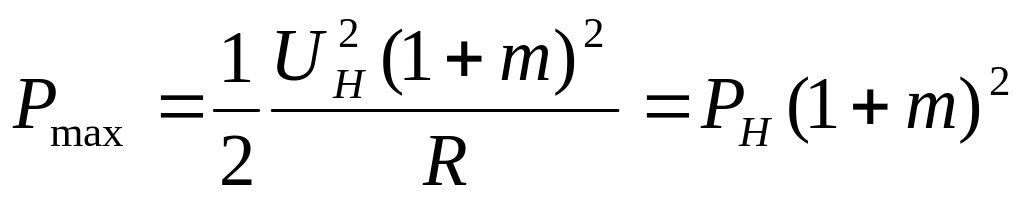 - амплитуда Uвых достигает максимального значения – режим максимальной мощности: U=Uн(1+m) – II;