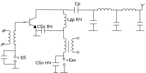 Модулирующее напряжение подается в цепь базы и коллектора.