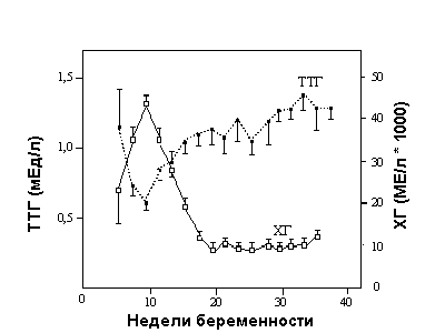 ХГ, вырабатываемый во время беременности, непосредственно стимулирует ЩЖ матери. ХГ действует как слабый ТТГ, поскольку по своему строению близок к нему: гормоны имеют одинаковую по структуре a-субъединицу и специфичные b-субъединицы ( 1 ЕД ХГ = 0,02 мЕД ТТГ). Этим может быть обусловлено увеличение ЩЖ. ХГ вызывает незначительное повышение свободногоТ4 и приводит к снижению в плазме ТТГ в I триместре беременности(между 8 и 14 неделями). Повышение уровня ХГ на 10000 МЕ/л приводит к повышению уровня свободного Т4 на 0,6 пмоль/л и подавлению базального уровня ТТГ на 0,1мЕ д/л. Изменения содержания ТТГ происходят обычно в рамках нормативных значений (<4 мЕ д/л). Подобная динамика наблюдается более чем у 80% беременных. Однако в 20% случаев уровень ТТГ может транзиторно снижаться до нижней границы нормы (<0,2 мЕ д/л), что свидетельствует о подавлении гипофизарно-тиреоидной системы. Кроме того, примерно в 10% случаев с субнормальным уровнем ТТГ, т.е. у 1 - 2% всех беременных, уровень свободного Т4 может превышать нормативные значения, способствуя развитию тиреотоксикоза в I триместре беременности. Этот синдром транзиторного тиреотоксикоза часто ассоциируется с неукротимой рвотой беременных.
