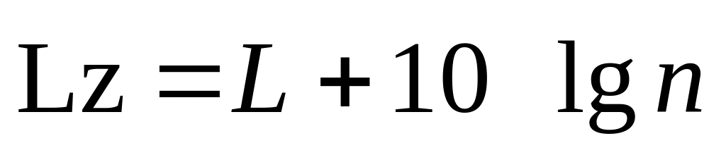 ● Якщо є п однакових джерел шуму з рівнем звукового тиску І, що створюється кожним джерелом, то сумарний рівень звукового тиску Lz визначається по формулі: