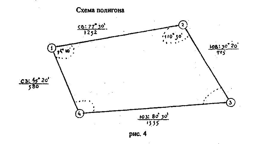 Вычисление дирекционных углов сторон полигона вести по ходу часовой стрелки. По значениям дирекционных углов вычислить румбы сторон полигона и выписать их значения на схематический чертеж полигона (см. образец, рис.6). Пример.