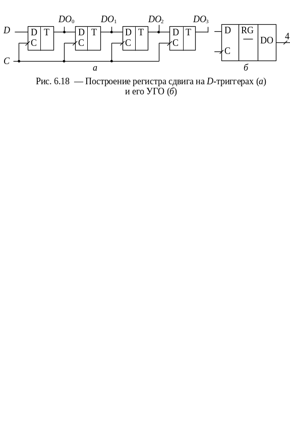 Регистры сдвига строятся на D-триггерах с динамическим управлением. Тактовые входы объединяются, вход D первого триггера служит для приема информации, а входы D последующих подключаются к прямым выходам предыдущих (рис. 6.18).
