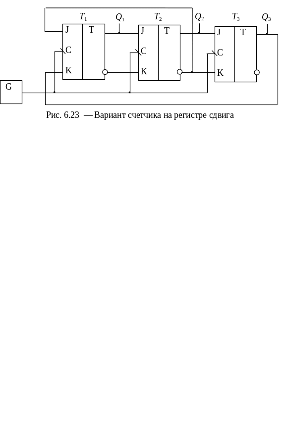 Исследуемое устройство представляет собой синхронный счетчик на регистре сдвига, построенном на трех JK-триггерах. Состояние первого триггера после подачи очередного среза счетных импульсов генератора G зависит от сигналов обратной связи, поступающих на его информационные входы J и K с выходов Q2 и Q3. Триггер Т2 повторяет состояние триггера Т1 на предыдущем такте, а триггер Т3 — состояние триггера Т2.