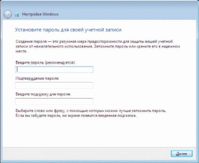 Затем вам будет предложено придумать пароль для своей учетной записи, пароль не обязателен и если кроме вас никто компьютером больше не пользуется или у вас нет конфиденциальной информации, которую нужно сохранить в тайте, то пароль можно не указывать.