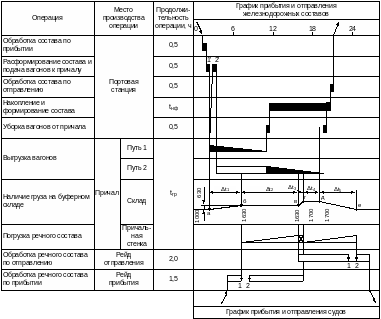 Рисунок 4 - Контактный график взаимодействия железнодорожного и речного транспорта в порту при несогласованном поступлении судов и вагонов и использовании буферного склада