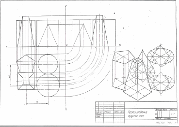 Изображения предметов на чертежах выполняют методом прямоугольного (ортогонального) проецирования. Построение вести в тонких линиях. Провести оси проекции, оси вращения, высоты у геометрических тел, центровые линии, линии связи. Разобрать геометрические тела по видимости. Видимые ребра, контурные образующих показать сплошной основной, невидимые - штриховой линией. На комплексном чертеже размеры не ставить. На этом же листе выполняется их аксонометрия (изометрия). Все данные (размеры) берутся с комплексного чертежа и переносятся на изометрические оси. Направление осей в изометрии 120°. Коэффициент искажения принять равным 1,0. По учебной литературе изучить построение овала в изометрии. Построение овалов сохранить. Сохранить построение всех геометрических тел. Показать видимость. Заполнить штамп.