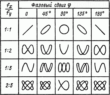 Якщо відношення частот fx / fy (або fy / fx) дорівнює двом, то фігура на екрані приймає вигляд вісімки, яка при початкових фазових зрушеннях 90 і 270 ° стягується в дугу. (Початковий фазовий зсув завжди оцінюється по відношенню до періоду напруги більш високої частоти). З таблиці, наведеної у додатку 3, видно, що чим більше числа дробу, що характеризує ставлення порівнюваних частот, тим складніше фігура Ліссажу, яка спостерігається на екрані.