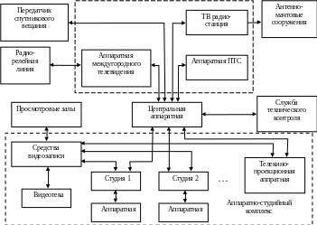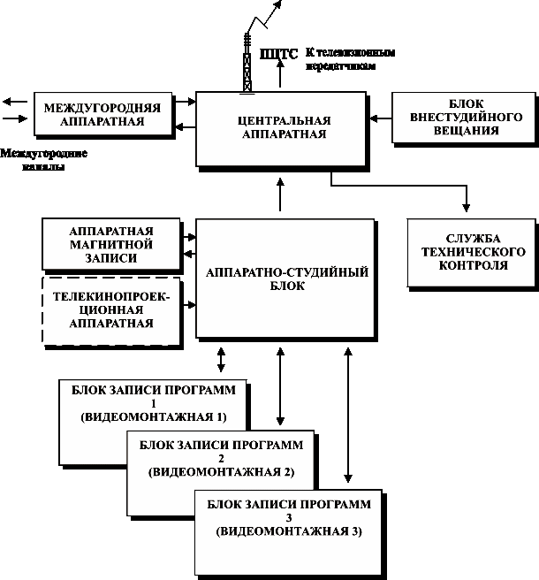 Укрупненная структурная схема телецентра показана на рис. 14.1. Достаточно крупный телецентр имеет аппаратно-студийный комплекс (АСК), предназначенный для производства ТВ программ, радиопередающий комплекс для тех видов вещания, для которых предназначен данный телецентр (эфирное, кабельное вещание, и т.д.), а также необходимое оборудование для связи с другими телецентрами, например, с помощью радиорелейной линии связи (междугородная аппаратная). Имеется также аппаратная для обслуживания передвижной телевизионной станции (ПТС), предназначенной для выездных съемок, проводимых вне студии, для трансляции концертов, спектаклей и т.д.