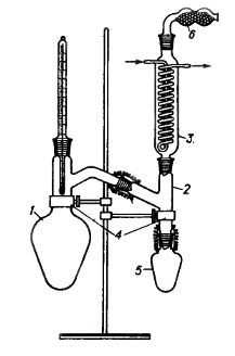 1 — перегонная колба с отводом; 2 — переход с двумя горловинами; 3 — холодильник со змеевиковым охлаждением (Димрота); 4 — держатели (лапки); 5 — приемная колба; 6 — хлоркальциевая-трубка (при перегонке абсолютных растворителей)