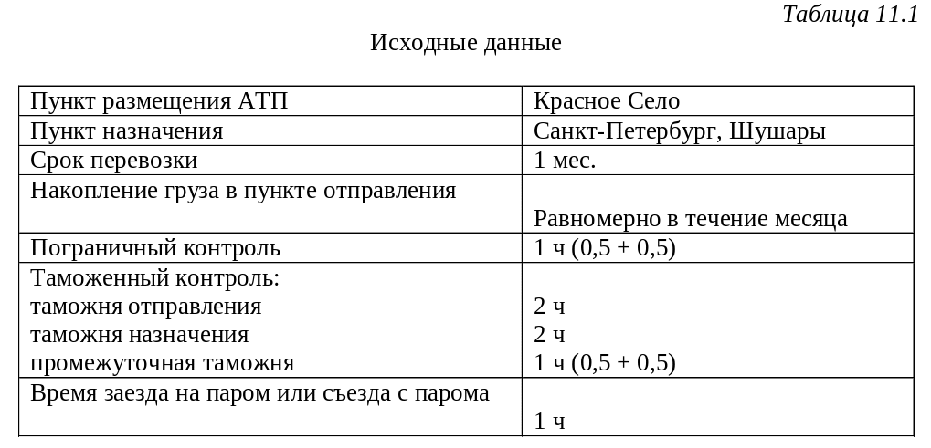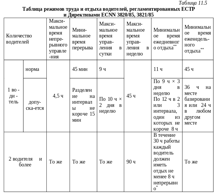 Время на отдых водителя в пути t отд предоставляется с учетом требований Европейского соглашения, касающегося работы экипажей транспортных средств, производящих международные автомобильные перевозки. Требования данного соглашения приведены в табл. 11.5. В случае, если в расчет закладывается допускаемый норматив, любое сокращение продолжительности отдыха должно быть компенсировано эквивалентным временем отдыха, если оно используется целиком до конца третьей недели, которая следует за данной неделей.