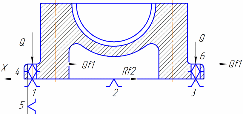 Відповідно до цих умов розраховуємо необхідну для надійного закріплення заготовки силу затиску Q.