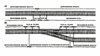 В местах примыкания бесстыкового пути с железобетонными шпалами к участкам звеньевого пути с деревянными шпалами, к стрелочным переводам с деревянными брусьями, башмакосбрасывателям, уравнительным приборам и т.п. железобетонные шпалы следует укладывать по схемам, показанным на рис. 2.1, причем на конце первого звена уравнительного пролета, примыкающего к плетям бесстыкового пути, укладываются четыре деревянные шпалы.